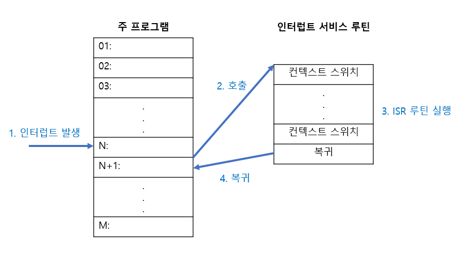 - CPU는 순차적으로 다음 명령(N+1)을 수행하는 것이 아니라, 실행 흐름 제어는 해당 인터럽트 서비스 루틴으로 변경합니다.